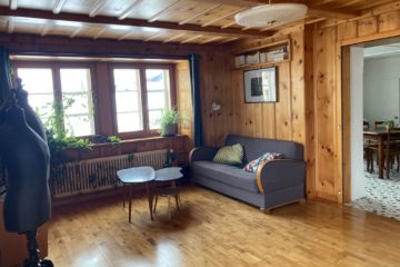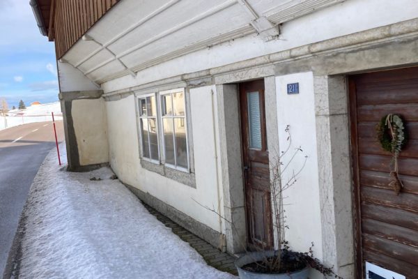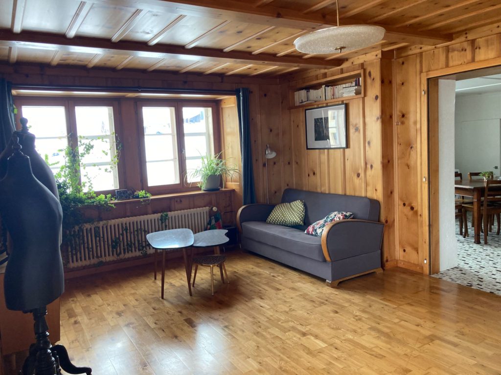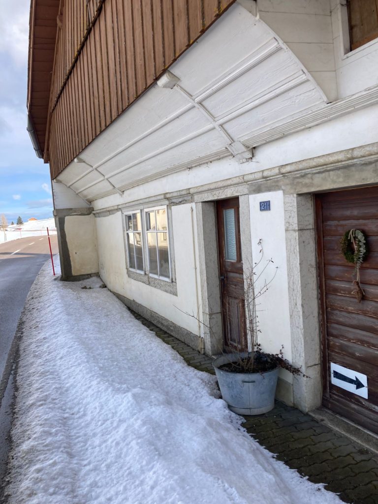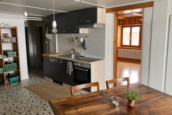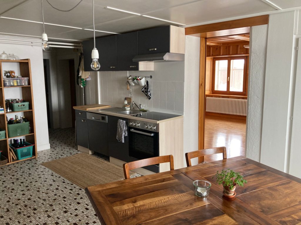 Appartement de 3 chambres en duplex dans ancienne ferme, cuisine agencée, salle de bains/WC. Ecurie à disposition, nombreux espaces de rangement, espace extérieur et garage.